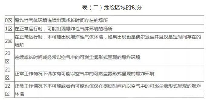根據爆炸性環境的頻率和持續的時間把危險場所劃分為不同的區域。氣體場所劃分為三個區域:0區,1區和2區;粉塵場所分為三個區域:20區,21區和22區。如表(二)所示: