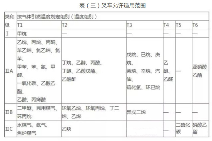 對于I、II區爆炸性氣體環境表(三)為叉車允許適用范圍,表(四)為危險區域的溫度組別劃分。
