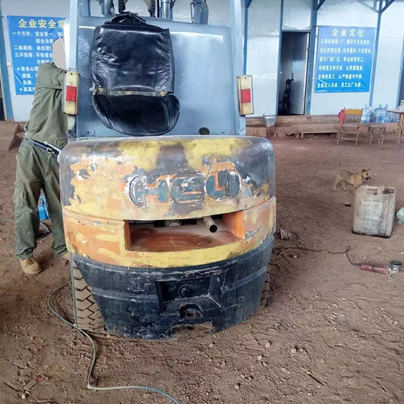 這臺翻新的叉車,可以肯定的說是假冒偽劣叉車,從圖中我們可以看到配重打磨過的痕跡,黑乎乎的,似乎已經準備完工。